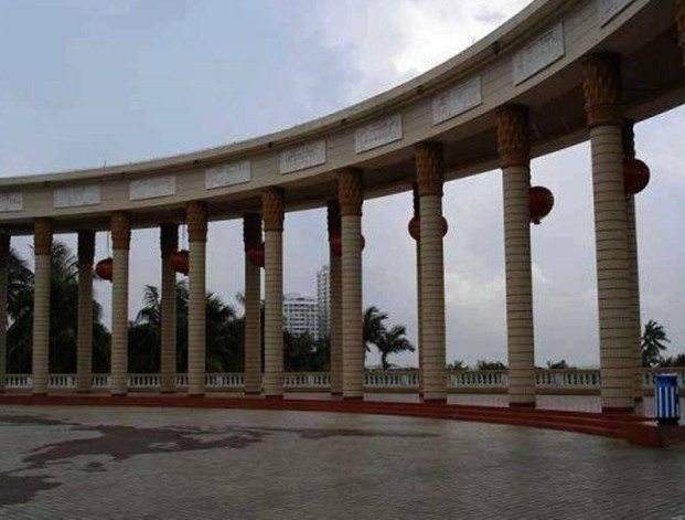 湛江海濱公園位于霞山區(qū)東北角海濱,這里有細白的沙灘、湛藍的海水、挺拔的椰樹,如茵的芳草,鮮艷的花卉。富有亞熱帶海洋風光,被稱為湛江的“城市客廳”。時代廣場就是公園的大門。大門為歐式建筑風格,由二十根圓柱頂起一弧形柱廊,上方鑲嵌著九幅漢白玉浮雕,浮雕描繪了湛江百年歷史,廣場地面用紅、褐、灰三色馬賽克拚成一幅世界地圖。