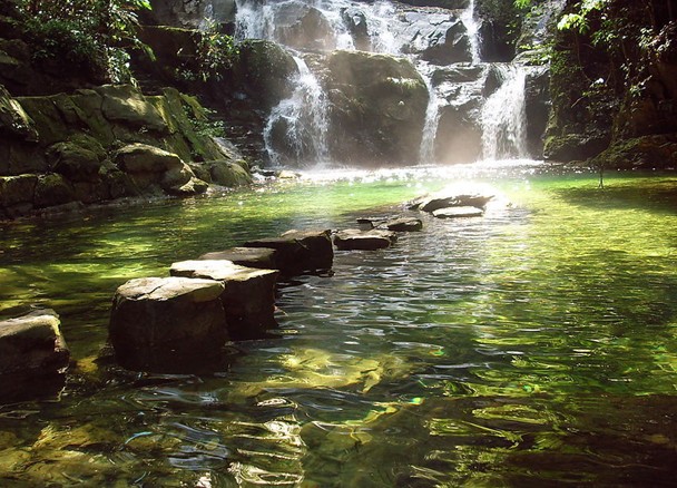 鼎湖山飛水潭,又名龍?zhí)讹w瀑,位于鼎湖山南半山腰、慶云古剎下東側(cè)。 去飛水潭,由榮睿碑亭拾級(jí)登山,沿曲徑云封直上,至半山腰向右拐,過(guò)眠綠亭即可。當(dāng)然,亦可在榮壑碑亭前面的山溪邊起步,一直溯溪而上。這里,山石嶙峋,瀑布從40多米高的崖頂深處狂奔而來(lái),直往下飛瀉,忽而形成千尺飛流,如白練懸空,忽而濺作滿空雨花,如輕紗曼舞。瀑布下,如注的水流匯成一泓碧水,中有巨石,上刻“枕流”2字。辛亥革命后,孫中山先生偕夫人宋慶齡游覽鼎湖山時(shí),曾在此游泳,現(xiàn)崖壁上刻有宋慶齡手書(shū)的“孫中山游泳處”6個(gè)大字。潭水由此再往下傾瀉,繼而形成另一個(gè)深潭,據(jù)傳為蟄龍窟,故曰:浴龍池。 飛水潭側(cè)建有更衣室,崖間建有觀瀑亭,崖壁鐫刻著許多贊美飛水潭的摩崖大字和方寸小楷,如“噴雪”、“能移我情”、“天然圖畫(huà)”、“飛泉咽危石”等,頗有詩(shī)情畫(huà)意。 夏日到此,觀瀑、游泳、濯足,均感遍體清涼,煩熱頓消。