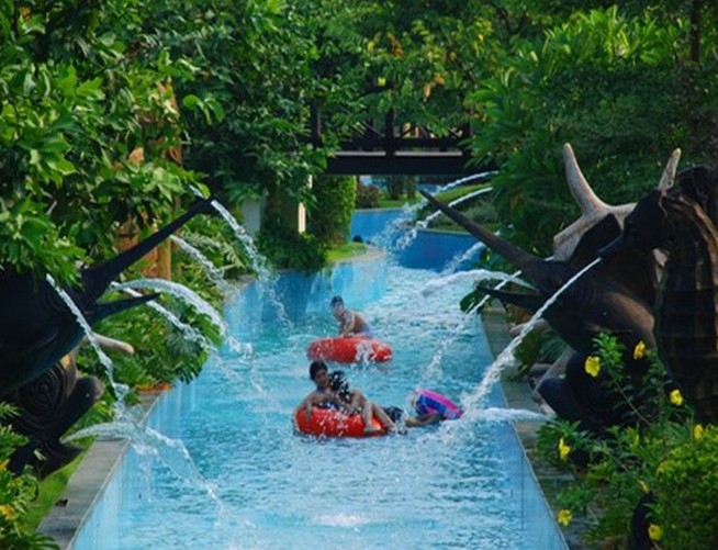 廣東最大的原生態(tài)熱帶雨林主題游樂區(qū),擁有各種不同的水滑道和玩水活動。當(dāng)屋頂?shù)拇竽就把b滿水時就會傾倒而下,讓您享受如瀑布般的清涼快感!特別為兒童設(shè)計,擁有多套適合小朋友和家庭游玩的大小型水娛樂設(shè)施,既是孩子們的樂園,也是家庭放松的理想之所。