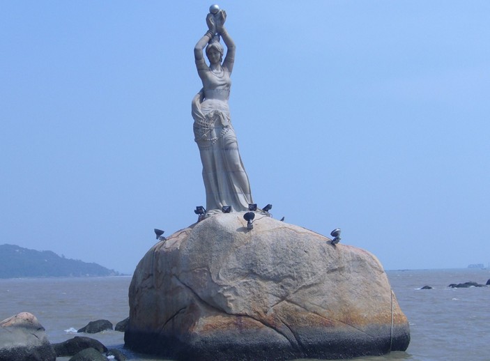 珠海市風(fēng)景秀麗的香爐灣畔,矗立著一尊巨型石雕——珠海漁女,一條美麗整潔的環(huán)海大道——情侶路從她身旁穿過,更使她顯得純潔而大方。她領(lǐng)戴項(xiàng)珠,身掮魚網(wǎng),褲腳輕挽,帶著喜悅而又含羞的神情雙手高高擎舉著一顆晶瑩璀璨的珍珠,獻(xiàn)給德高望重的九洲長老,并向世界昭示著光明,向人類奉獻(xiàn)珍寶。
