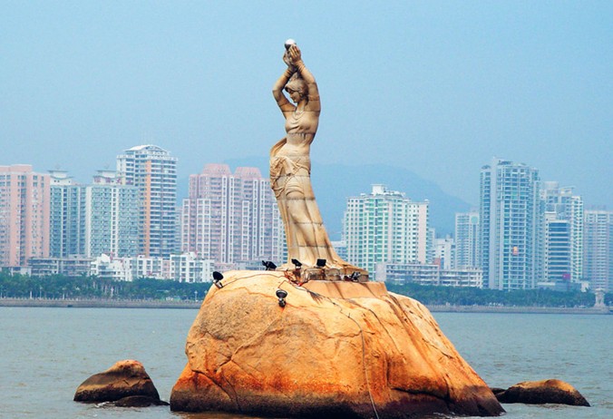 珠海漁女是珠海市的象征,位于珠海風(fēng)景秀麗的香爐灣畔,矗立著一尊巨型石刻雕像——珠海漁女,她領(lǐng)戴項(xiàng)珠,身掮漁網(wǎng),褲腳輕挽,雙手高高擎舉一顆晶瑩璀璨的珍珠,帶著喜悅而又含羞的神情,向世界昭示著光明,向人類奉獻(xiàn)珍寶。