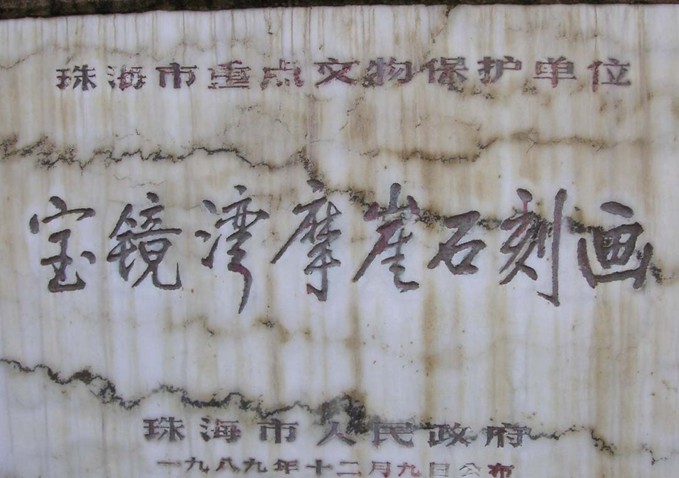 寶鏡灣摩崖石刻畫,位于廣東珠海市高欄島寶鏡灣,于1989年10月被發(fā)現(xiàn),共4處6幅,散布于海灣所在的山腰、山麓200米范圍內(nèi),其中最大的一幅長5米、高3米。巖畫陰刻于大塊平整的石面上,圖案密集而復雜,形狀有船、波浪、龍蛇、舞蹈人等,經(jīng)專家考證,是距今二三千年前青銅時代的產(chǎn)物,是南越先民生活的寫照。