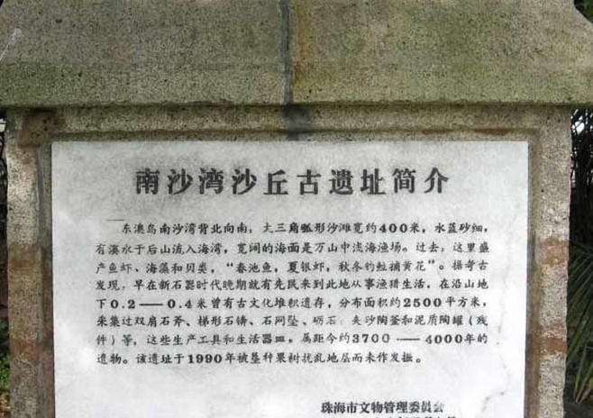 沙灣古遺址位于淇澳島東部高出海岸的沙丘上,1984年文物普查中在這里發(fā)現(xiàn)了新石器時(shí)代的彩陶文物,成為廣東省境內(nèi)屈指可數(shù)的歷史年代較早的古文化遺址之一。