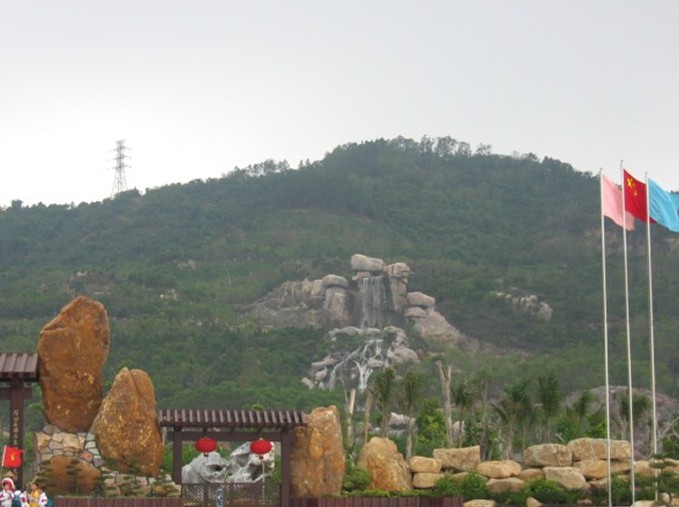 由我國(guó)園林名石——廣東英石、江蘇太湖石以1:1000倍比例按廣東嶺南派著名畫家林風(fēng)俗教授的水墨山水名畫——“天下第一盆景”為藍(lán)本放樣砌成。