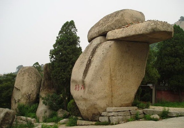 八卦石 八卦石是古代嶧山的五大奇觀之一。奇就奇在這兒原來有八塊大石頭,由東向西依次排列,高度相當(dāng),每塊石面都有斷紋。八塊石頭的斷紋正好與《周易》八卦的卦爻相吻合。非??上У氖牵逵赫哪辏?726年)修奎星閣毀掉了幾塊石頭。嘉慶十二年(1807年)拓建通明天宮戲樓,又毀掉了幾塊石頭。現(xiàn)在只能看到乾、坎、艮三卦的卦爻了。