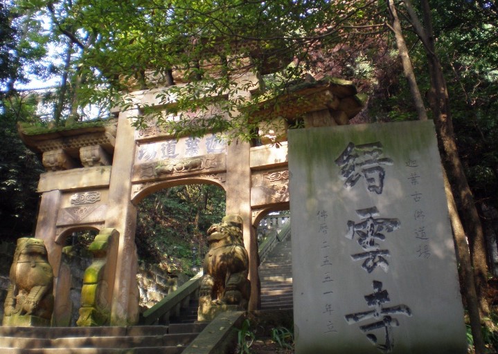 縉云山是具有1500多年歷史的佛教勝地。山中縉云寺,始建于南朝劉宋景平元年(423年),后曾稱“相思寺”、“崇勝寺”、“崇教寺”,受到歷代帝王封賜。寺中自古辦學,名為“縉云書院”。寺內(nèi)現(xiàn)存有宋太宗誦讀過的24部梵經(jīng)。寺外石照壁上“豬化龍”浮雕,為六朝文物。另有出土的石刻天王半身殘像,據(jù)傳是梁或北周作品。唐高祖李淵(618年)曾親筆題名“禪真宮”,唐大中元年(847年),宣宗皇帝賜寺額為 “相思寺”,系山有相思巖、相思竹、相思鳥之故。唐乾符元年(874年),定濟和尚重建寺廟,971年慧歡禪師主持修葺殿宇。998年,宋真宗將太宗讀過的梵經(jīng)240卷送到這里,供奉在寺中。宋景德四年,真宗賜名“崇勝寺”。明永樂五年成祖皇帝敕諭“縉云勝景”,明天順元年(1462年)英宗皇帝又踢名“崇教寺”,萬歷三十年神宗皇帝下令改為縉云寺,賜題“迦葉道場”。明末清初,寺毀于火災.傳說是因為當時寺內(nèi)和尚,橫行四鄰,當?shù)乩习傩蘸拗牍牵脧埆I忠入川時,聚眾上山一把火把寺燒毀,現(xiàn)存的寺廟是清康熙二十二年(1683年)由破空和尚主持修復的。1930年秋,曾任世界佛學苑苑長、中國佛教學會會長、中國佛教整理委員會主任的太虛大師(1889-1947)“游化人川”,得知四川劉湘有“選派漢人入藏”之意,乃建議成立漢藏教理院,以研究漢藏教理,融洽中華民族,發(fā)揚漢藏佛學,增進世界文化交流,得到了渝州(今重慶)軍、政、金融界知名人士的大力支持,遂選定縉云寺作校址,推選劉文輝為名譽院長、太虛為院長、何北衡為院護,共同組成漢藏教理院董事會。該院辦學20年,為我國培養(yǎng)了大批佛教人才。當年學生現(xiàn)遍及世界各地,重慶佛教協(xié)會會長惟賢法師等均是太虛法師的學生??N云寺漢藏教理院號稱世界佛學苑四大分院之一。寺內(nèi)大雄寶殿上塑有迦葉古佛,高約2米。兩旁站立帝釋、梵天,都是清代塑像。其外有一匾額,上書“曇花藹瑞”。寺內(nèi)還有一口大鐵鐘,高約1.60米,底徑1.50米,腰徑0 9米,為清道光二年(1822年)所鑄。山門外,兩棵參天銀杏直向青天,古剎鐘聲與山間松濤相映成趣。寺內(nèi)的雙柏精舍為方丈居室,兩側(cè)禪房與石刻,形成古色古香的意趣。在寺 外,還存有世界佛學苑漢藏教理院碑記及太虛法師和正果法師塔各一座,上有趙樸初和鄧穎超的親筆題字。