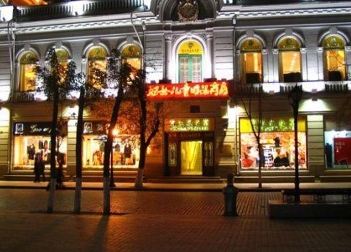原為俄國(guó)商人伊•雅•秋林開(kāi)辦的秋林商行道里分行。建于20世紀(jì)初期,磚木結(jié)構(gòu),仿文藝復(fù)興建筑風(fēng)格。首層以連續(xù)的腰線分割,墻面采用仿塊石砌筑,二層為對(duì)方額高窗,窗口上有石膏花飾,與一層的大玻璃窗相對(duì)應(yīng)。檐上做間斷的女兒墻,上面飾以巴洛克式浮雕,建筑頂部的轉(zhuǎn)角突出,屋頂輪廓富有變化,檐口下有精美的裝飾造型。哈爾濱Ⅱ類(lèi)保護(hù)建筑。