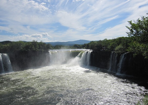 吊水樓瀑布,又稱鏡泊湖瀑布,它位于黑龍江省寧安縣西南,從牡丹江市向南經(jīng)古城寧安,再向西行抵達(dá)東京城后,從這里一直行駛30公里,便可抵鏡泊湖的北湖頭。瀑布幅寬約70余米,雨水量大時(shí),幅寬達(dá) 300 余米。落差 20 米 。它下邊的水潭深 60 米 ,叫“黑龍?zhí)丁薄C糠暧昙净蜓雌冢暼缋?,激流呼嘯飛瀉,水石相擊,白流滔滔,水霧蒸騰出繽紛的彩虹。它形狀好像加拿大亞尼亞加拉大瀑布,是世界最大的玄武巖瀑布。