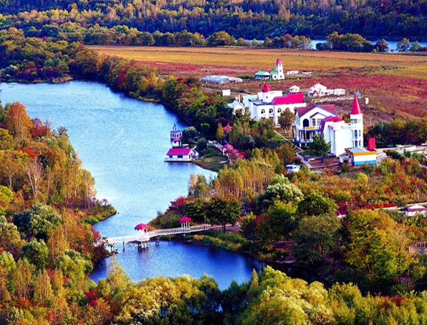 臨近回龍灣,只見具有古典建筑風格,版權(quán)所有山東聊城聊之旅國際旅行社有限公司,轉(zhuǎn)載必究!上書“回龍灣山莊”幾個大字的門樓赫赫然映入眼簾。沿石甬路來到渡口-----“湯旺第一渡”,是進入回龍灣山莊的惟一渡口。位于山莊牌樓東500米處,在河兩岸各有一座造型別致的懸索墩臺,上有振翅飛的大型雕塑天鵝,將100余米鋼纜銜于口內(nèi),東拉西扯,蕩悠悠橫于碧波之上。木制懸浮碼頭,隨水勢起落調(diào)整高低。鐵殼雙舟并聯(lián),每次可載60人左右,雙舟在河水沖擊下,滑輪滾動,兩岸擺渡,既安全又充滿情趣,真可謂舟在水中游,人在畫中走。渡過百余米寬的湯旺河,棄舟登岸,映入眼簾的是刻有黑龍江省副省長、原伊春市市委書記王東華同志的題詞“青山無限美,碧水寄真情”的石牌。再往前走就來到了回龍灣正門,正門上書“湖山勝境”,言外之意,跨入此門才算真正來到回龍灣山莊。沿著由水泥預制板鋪成的小路往前走,展現(xiàn)在我們面前的是一尊造型獨特、妙趣橫生的“黑龍騰天”雕塑。黑龍眼望長空,尾巴翹立,欲騰飛離去,卻又顯出無限的眷戀之情,意味著不愿離開這美麗的地方。臨清別墅:屬回龍灣風標志性建筑,臨河而建,外觀為典型的歐式風格。哥特式的紅色尖頂及拜占庭式的主體框架,配以乳白色的歐式風格。哥特式的紅色尖頂及拜占庭式的主體框架,配以乳白色的白色的墻壁、碩大的藍色落地窗,顯示出浪漫的一國情調(diào),其每層風格各異。一樓為會客室,寬敞明亮,一幅巨大的太公垂釣木雕附于廳壁,角落有日式內(nèi)室稱為“和寮”;二樓的“漢閣”正墻上懸掛一幅精心裱褙的字軸,上面完整地記敘了回龍灣開建設(shè)歷史;三樓為“獵舍”,彷舊時獵舍居室風格裝修,古樸典雅,耐人尋味。蒙古村落:位于回龍灣南于東皋臺隔灣相望,有五座敖包組成。錯落有致地排列于萋萋芳草中。一架勒車閑置在包前,幾只散養(yǎng)的牛羊在沒膝深的野草叢里悠然吃草,裊裊炊煙從敖包頂端升起.不時有身著鮮艷民族服裝的姑娘手托著香氣撲鼻的菜肴出入包中,儼然成吉思汗的子孫們活生生的場景.此時那首有名的"敕勒川,陰山下,天似穹廬,籠蓋四野,天蒼蒼,野茫茫,風吹草低見牛羊"的 《敕勒歌》便會自然涌上腦海.敖包內(nèi)裝飾極具民族風格,是游人就餐之地.熏羊腿、燒牛寶、手把肉、烤全羊等佳肴,其味美純正,風味十足,定會使你大飽口福.