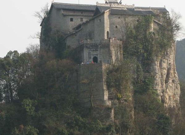 天臺山伍龍寺是屯堡古寺廟建筑的典范,它雄峙于一峰獨(dú)秀的天臺山上,四周城墻懷抱,是軍事功能和宗教功能合一的建筑。伍龍麉是屯堡古寺廟建筑中保存最完整的明清建筑群。它始建于明萬歷十八年(公元1590年),被建筑專家贊譽(yù)為“石頭建筑的典范”、“深山明珠”。它的結(jié)構(gòu)分內(nèi)外兩部分,外部均用石塊砌壘,與山巖由于風(fēng)化造成的水平線十分接近,渾然一體,表現(xiàn)出粗獷的性格,墻壁上開極少的貓窗。