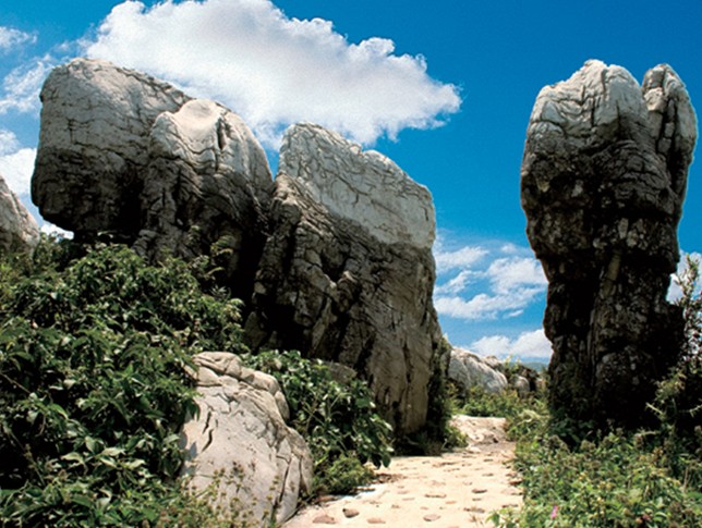 韭菜坪為貴州最高峰,站在山頂,可目掃鐘山區(qū)、水城、赫章、威寧縣鄰近主峰之大片轄區(qū),遠(yuǎn)山如浪,山與天相連,四周群山皆小。與韭菜坪峰頂遙相對應(yīng),被萬畝草場環(huán)繞著的千畝石林面積不低于6平方公里,林內(nèi)奇石密布,造型各異,風(fēng)姿迥然,以未曾粉飾過的沌潔的滿身靈氣,或立或臥或行,或玲瓏剔透,或魁偉遒勁。本地人稱之為洛布石林,彝族語即“落布惹”,大意是滑竹與石頭構(gòu)成的森林,也可以說成是像古代民族一樣的石林。韭菜坪嶺上氣象萬千,變幻多端:晴日,目窮數(shù)百里,收眾山于眼底;陰時(shí),視線不過數(shù)米,如沉霧海;雨天,或細(xì)雨如絲撲朔迷離,或暴雨傾盆,山怒峰吼;雨后初晴,云海茫茫,千山若隱若現(xiàn);春日,山下已是萬紫千紅,山上卻積雪未盡,草木沉睡,一旦春光普照臨山,滿山植物搶時(shí)放綠開花結(jié)實(shí);春夏之交,一旦烏云密布,冰雹驟然而至;夏令,山上和曦送涼,山花爛漫,杜鵑點(diǎn)紅;秋季,紅葉遍野,金絨滿地,八月左右,滿山提早換上“黃袍”,寒氣一襲,竟會大雪紛飛;十月,就銀裝素裹,聳亙皓幛。韭菜坪景區(qū)距西南交通樞紐六盤水市70公里,距國家級自然保護(hù)區(qū)威寧草海70公里,國家級風(fēng)景名勝區(qū)織金洞200公里,國家級森林公園百里杜鵑150公里,位于貴州西部旅游景點(diǎn)中心線上,以國家二級水泥路面標(biāo)準(zhǔn)改建的216省道就與韭菜坪山麓擦肩而過,經(jīng)幾億年風(fēng)化而成,或如萬馬奔騰,百萬雄兵布陣。