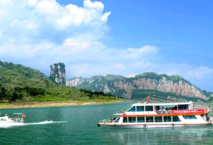 烏江源頭寬闊清澈的河流,串起了“中國(guó)最美的洞穴”織金洞,以及“中國(guó)巖溶百科全書(shū)”九洞天兩個(gè)國(guó)家級(jí)重點(diǎn)風(fēng)景名勝區(qū)。烏江兩岸山石氣勢(shì)雄偉,形成水西姑娘、天竹奇峰、天鵝戲水、大鵬展翅等景點(diǎn)。乘船順流而下,還可以看到極具民族特色的當(dāng)?shù)孛窬印?千里烏江發(fā)源于烏蒙山脈,而其北源六沖河,南源三岔河,都發(fā)源于貴州西部地勢(shì)最高的威寧彝族自治縣,兩條源流分別在深深的峽谷里流淌了幾百公里后,終于匯合成了烏江。 東風(fēng)湖 “烏江畫(huà)廊”神美之筆——東風(fēng)湖,風(fēng)光迷人,景色秀麗,融高峽、平湖、溶洞、飛瀑等景色為一體,素來(lái)被譽(yù)為“山似三峽而水勝三峽,水似漓江而山勝漓江”。曲折的11道彎,蘊(yùn)藏著雄渾之美、神肖之美、逶迤之美。