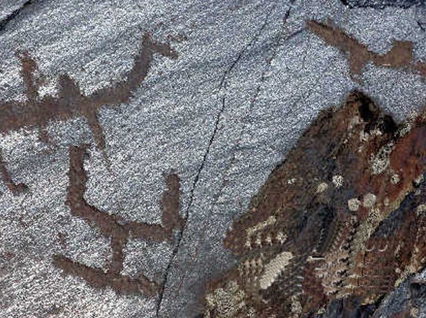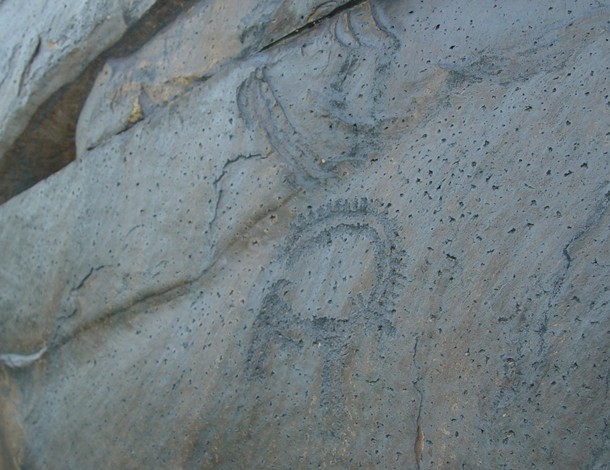 畫馬崖巖畫群中的巖畫,是用極其簡單的線條勾勒出的各種造型,類似于現(xiàn)代繪畫中的速寫風(fēng)格,但是其線條卻異常簡潔甚至抽象,寥寥數(shù)筆卻惟妙惟肖。以現(xiàn)代人的認(rèn)知對這些圖案進(jìn)行解讀,簡單線條勾畫出的圖案可能是馬、人和太陽,還有一些魚、虎、龍、狗、仙鶴等等。然而,專家考察卻發(fā)現(xiàn),巖畫中描述人的線條頭型呈不規(guī)則的圓隆狀,四肢和身體都用形狀不同的線條表示。