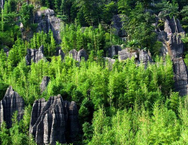 綠色石林地處貴州省貴陽市修文縣,占地1000多畝。景區(qū)內(nèi)眾多奇峰怪石拔地而起,似劍如戟,破土直刺蒼穹。石峰最高達(dá)30余米,又有地峽石罅幽深曲折。因綠樹古藤、蟠枝虬根常年攀附石峰,使石林平添了幾許柔情,獲得了“綠色”石林的美譽。又因它造型迥異的石形而贏得了“擬態(tài)動物園”的美名。