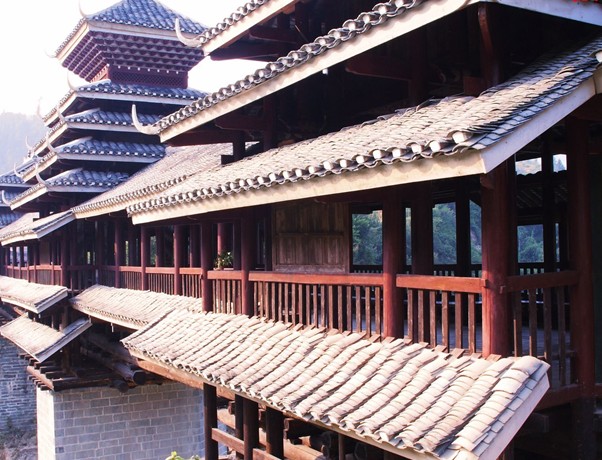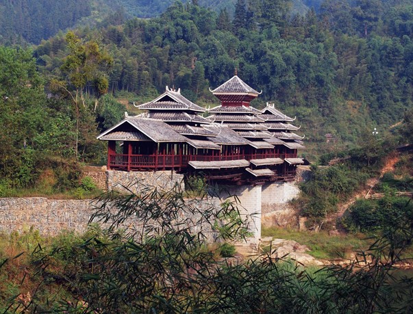 地坪風(fēng)雨樓 這是貴州省最大、造型最美的風(fēng)雨橋。長(zhǎng)達(dá)50多米的地坪風(fēng)雨橋始建于清光緒二十年即公元1894年,1959年毀于火災(zāi),1964年重建。整座橋不用一釘一鉚,而運(yùn)用杠桿力學(xué)原理,將大小不一的柱、枋、檁、凳、欄桿等全部用杉木鑿榫穿枋構(gòu)成。橋體為長(zhǎng)廊式木結(jié)構(gòu),橋上有一大兩小共三座橋樓。居中的大橋樓是鼓樓式建筑,兩邊的橋樓皆為三層重檐雙斜面屋頂。橋內(nèi)側(cè)的壁板上繪有紡紗織布、吹笙拉鼓等20多幅表現(xiàn)侗鄉(xiāng)風(fēng)俗的彩色圖畫(huà)。四周的侗族人家十分樸素,毫不起眼,更襯托得地坪花橋猶如落地的彩虹,分外美麗。