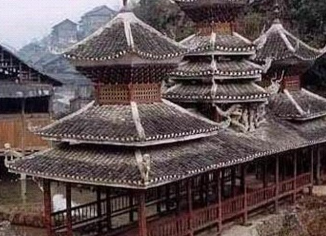 地坪風(fēng)雨樓 這是貴州省最大、造型最美的風(fēng)雨橋。長(zhǎng)達(dá)50多米的地坪風(fēng)雨橋始建于清光緒二十年即公元1894年,1959年毀于火災(zāi),1964年重建。整座橋不用一釘一鉚,而運(yùn)用杠桿力學(xué)原理,將大小不一的柱、枋、檁、凳、欄桿等全部用杉木鑿榫穿枋構(gòu)成。橋體為長(zhǎng)廊式木結(jié)構(gòu),橋上有一大兩小共三座橋樓。居中的大橋樓是鼓樓式建筑,兩邊的橋樓皆為三層重檐雙斜面屋頂。