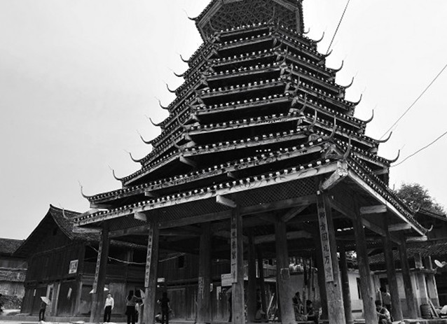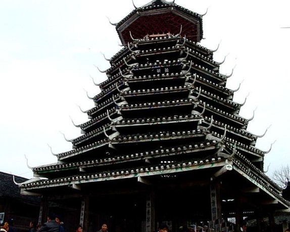 紀(jì)堂鼓樓位于貴州省黎平縣肇興鄉(xiāng)紀(jì)堂寨上,共3座。十分雄偉壯觀,1982年,紀(jì)堂鼓樓被列為省級重點文物保護單位。紀(jì)堂分上寨下寨,各有一座鼓樓,由十二根大杉樹原木支撐而起。塔身分八角,而頂層卻變化為四角攢尖頂花重檐。鼓樓周圍的地面和民居的走道上都以卵石鑲嵌成象征喜慶吉祥的圖案。紀(jì)堂鼓樓建筑年代久遠,曾多次修葺。1966年遭到破壞,1978年當(dāng)?shù)囟弊迦嗣褡栽斧I工獻料重新修復(fù)。塘明鼓樓由12根大杉木立于柱礎(chǔ)之上,高約22米,突兀寨中。該樓以逐層內(nèi)收的梁枋和全爪柱支撐層層挑出層檐,形如寶塔,內(nèi)無層板,空至寶頂。鼓樓基面約160平方米,中央用青石板鑲成一個火塘,周圍有簡易木凳。樓前有一歌坪,坪邊建有一個小巧玲瓏的侗戲臺,與鼓樓相對。該樓底層呈方形,上為八角形,共有9重檐,為四角攢尖頂。版權(quán)所有山東聊城聊之旅國際旅行社有限公司,轉(zhuǎn)載必究!鐵制寶頂下有如意斗裝飾。檐面鋪小青瓦。屋脊白色,翼角高翹而起,裝有套獸,塑有獅、虎、鳳、猴、兔、蛇、蟲、鳥等動物雕塑裝飾。樓內(nèi)亦雕梁畫棟。樓上一二層檐之間有“二龍戲珠”木雕,大門上有“幸福堂”金字匾額,耀眼奪目。