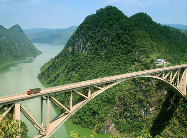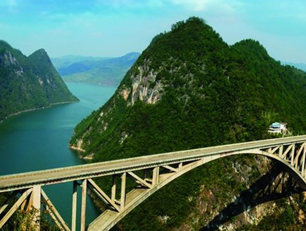 江界河大橋是交通部和貴州省重點科研項目“大跨度桁式組合拱橋研究”課題的依托工程,1995年12月竣工通車。該橋位于甕安縣境內的烏江中游峽谷上,全長461米,主孔跨經330米、寬13.4米,橋面距水面高263米。大橋采用人字桅桿吊機懸拼吊裝架設,其跨度居目前世界同類橋型之首,為世界第一座大跨度桁式組合拱橋,此項技術的研究和應用1996年獲貴州省科技進步一等獎,貴州省第9次優(yōu)秀工程設計一等獎,1997年度國家科技進步二等獎,1996年和1997年度獲交通部公路工程優(yōu)質工程一等獎。江界河大橋的建成,不僅溝通了甕安與遵義的公路交通,方便了兩地人民的經濟交往,而且為四川、重慶車輛經貴州入廣西、湖南提供了一條新的捷徑。