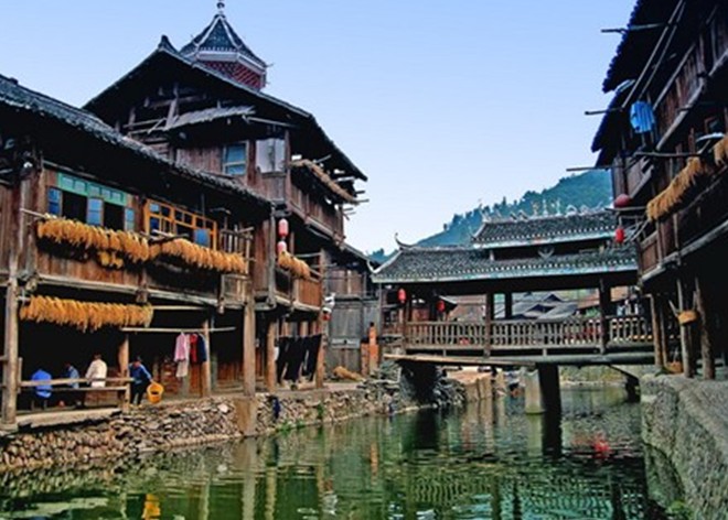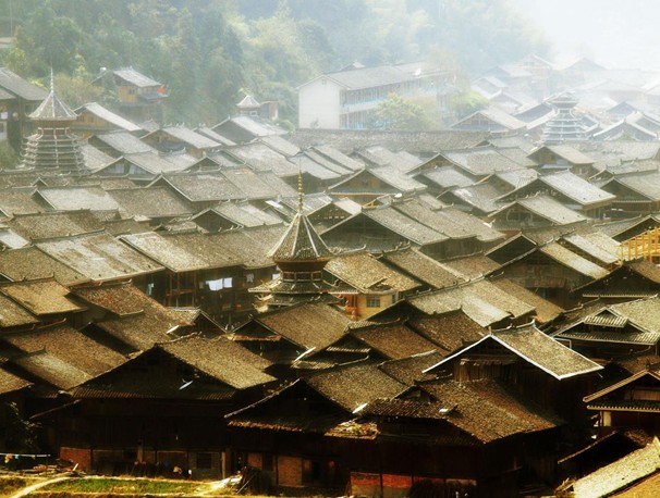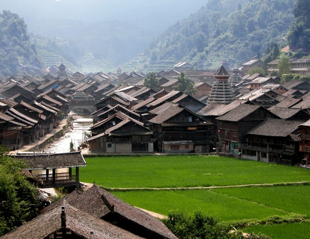 肇興,舊稱(chēng)[肇洞],位于黎平縣城南70公里,是全國(guó)最大的侗寨,有世界最大的侗寨鼓樓群。全寨居住3415人,聚居侗族3125人,全為陸性侗族,分為仁、義、禮、智、信五大房族,各自建有鼓樓、花橋,大小不一,高低不等,風(fēng)格各異,別具匠心。寨子里桿欄式吊腳樓房,鱗次櫛比,疏密有致,全用杉木建造。有眾多的花橋、戲樓、歌坪、禾晾、谷倉(cāng)、瓢井、侗民居中等建筑,布局緊湊,結(jié)構(gòu)合理。