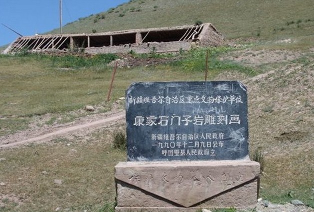 康家石門子巖雕刻畫是一幅國內(nèi)及世界上罕見的生殖崇拜巖畫。位于昌吉州呼圖壁縣的天山腹地, 兩條山溪匯流處的西北岸的新第三紀(jì)的粉砂巖壁上。巖面平整,距地表約10米上下。畫面東西長14米,上下高9米多,整個面積達(dá)120平方米左右。上面刻繪著二三百個大小不等,身姿各異的人物和動物。大者高 2.04米,小者19厘米。有男有女,或站或臥,或衣或裸,男女合圖、雙頭同體、三頭同體圖像。巖畫采用淺浮雕的手法,所雕人物的面部均面型瘦長,眉弓發(fā)育,大眼、高鼻、小嘴,形象秀麗。頭戴高帽,帽著翎毛,作舞蹈狀。相當(dāng)數(shù)量的畫面顯示或隱喻了男女交媾的動作。在此圖像下還刻繪了成排的小人在歡快舞蹈的場面,以表現(xiàn)祈求子嗣繁衍、人丁興旺的愿望。真實(shí)地體現(xiàn)了原始人祈求生育、繁衍人口的群婚制生活場面。