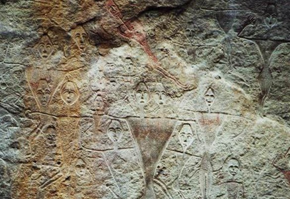 康家石門子巖雕刻畫是一幅國內(nèi)及世界上罕見的生殖崇拜巖畫。位于昌吉州呼圖壁縣的天山腹地, 兩條山溪匯流處的西北岸的新第三紀(jì)的粉砂巖壁上。巖面平整,距地表約10米上下。畫面東西長14米,上下高9米多,整個面積達(dá)120平方米左右。上面刻繪著二三百個大小不等,身姿各異的人物和動物。大者高 2.04米,小者19厘米。有男有女,或站或臥,或衣或裸,男女合圖、雙頭同體、三頭同體圖像。