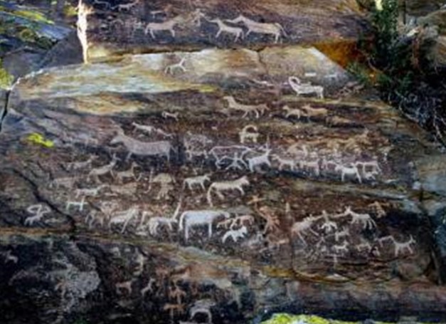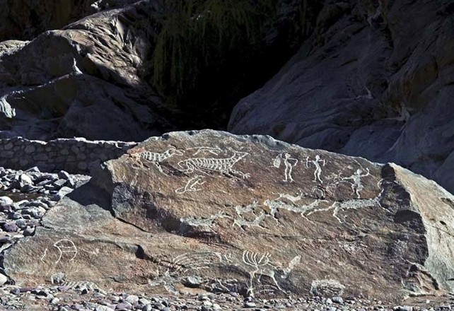 垂吉爾塔格山巖畫,位于托克遜縣城西北55公里處。在十幾、二十公里長的柯爾加依溝的山丘石壁或墜落的土黃色砂巖上,分布著數(shù)十幅栩栩如生、形態(tài)各異的古代巖畫。巖畫有放牧、狩獵和引水灌溉等圖案,以動物為主,有鹿、駱駝、豹、虎、狼、狗,最多的是大角羊。 畫中人物或行或立,或射箭或騎駱駝,他們頭戴大皮帽,腳穿長腰靴,腰部束帶,雄姿勃發(fā)。垂吉爾塔格山巖畫線條流暢,稀疏均勻,布局合理,鑿刻技藝高超,真實(shí)地反映了古代人生活放牧的情景,是新石器時(shí)代的作品。垂吉爾塔格山水系石刻圖距柯爾加依鎮(zhèn)西北5公里柯爾加依溝西岸的土黃色砂巖上,有一幅當(dāng)今世界上最早的水系石刻圖,它就是垂吉爾塔格山水系石刻圖。