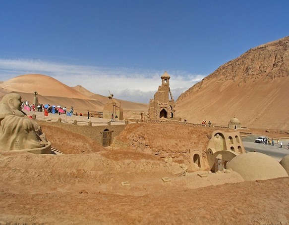 大漠土藝館文位于新疆吐魯番火焰山下。煙云繚繞的火焰山下,郁郁蔥蔥的木頭溝河畔,一座規(guī)模宏大的人文景觀以其獨(dú)特的藝術(shù)風(fēng)格,屹立在312國道西側(cè),它就是1991年5月對外開放接待游人的新疆火焰山大漠土藝館,地理坐標(biāo)89°32″7′,42°56″8′,海拔140米。這里是火焰山腹地的五百羅漢谷,是佛光寶地。眾所周知,自古名山僧占多,火焰山也不例外,著名的佛教遺址--柏孜克里克千佛洞就開鑿在此谷。