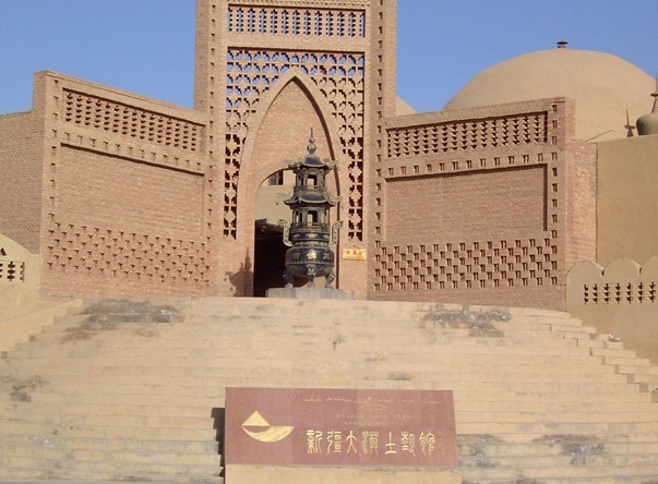 從312國道的勝金口往北拐上前往柏孜克里克千佛洞的旅游專線公路四公里處,便可看到千平方米的大型停車場后的高坡上矗立著一座高大的民族風(fēng)格建筑群,正中是十四米高的磚砌圖案大門,這就是大漠土藝館的正門。走進(jìn)大門,迎面可見三座互相連通的穹頂,穹頂頂端和四周布滿了小塔,好似金鋼寶座塔廟,這就是恢宏巨制的古代佛教藝術(shù)館---萬佛宮,是大漠土藝館的主體工程。這個大型宮堡由三個直徑十米、高十二米的窟窿頂建筑組成,是迄今新疆境內(nèi)最大的佛教藝術(shù)殿堂。據(jù)考古學(xué)家發(fā)現(xiàn),新疆古代的佛寺不少就是采用了這種式樣的建筑。有趣的是,世界三大宗教:基督教、佛教、伊斯蘭教都對窟窿頂建筑情有獨(dú)鐘。進(jìn)入宮內(nèi)迎面一尊十米高的彩繪大佛雄偉壯觀、氣派不凡,是依據(jù)焉耆出土的雕塑精品紅衣佛放大塑造的。東西二廳的壁畫以拜城克孜爾千佛洞、吐魯番柏孜克里克千佛洞珍寶穹被盜走和損毀嚴(yán)重的壁畫為藍(lán)本,由專家研究考證、復(fù)原繪制出的,新疆境內(nèi)有代表性的古代佛教壁畫一千二百余平方米,都覆蓋在宮內(nèi)自地面到頂端的墻壁上,工程巨大,耗時(shí)四載。來此參觀的游客足不出宮便可盡覽新疆古代佛教藝術(shù)的大略。