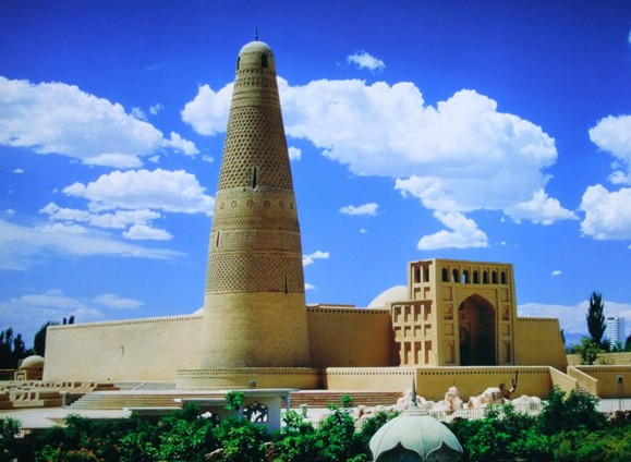 蘇公塔位于吐魯番市東郊2公里處的葡萄鄉(xiāng)木納爾村,是一座造型新穎別致的伊斯蘭教塔。蘇公塔是新疆境內(nèi)現(xiàn)存最大的古塔,建成于公元1778年,迄今已有230 多年的歷史,它是清朝名將吐魯番郡王額敏和卓,為了恭報(bào)清王朝的恩遇,表達(dá)自己對(duì)真主的虔誠(chéng),并使自己一生的業(yè)績(jī)流芳后世,而自出白銀7000兩建造。