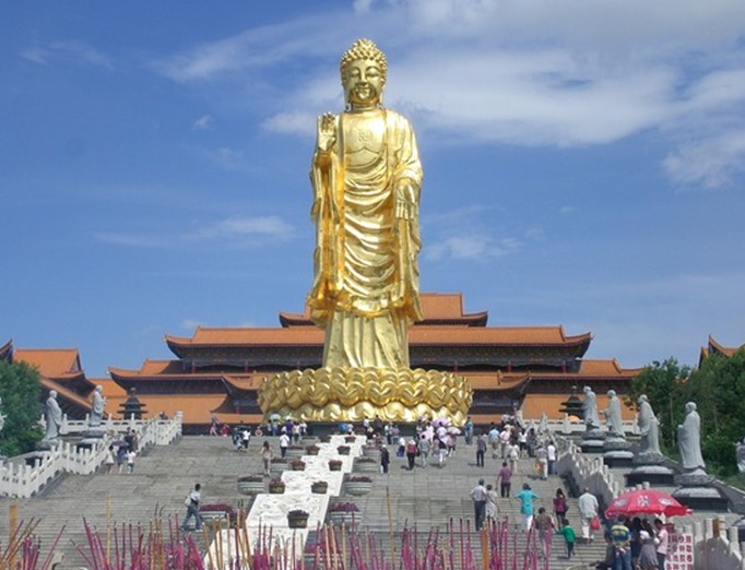 景區(qū)內的紅光山大佛寺伴隨著佛教寺院的梵音佛塔,若絲香火,晨鐘暮鼓,和佛祖來一次心與心的交流。感受佛教的博大精深。尤其是景區(qū)內高40.8米的西域大佛銅立貼金雕像,讓人充分領略佛教文化在西域的發(fā)揚與光大。大佛高高聳立,直入云端,氣勢之大顯得人更加渺小。大佛神態(tài)慈祥,身披金裝,一種普度眾生的超然神態(tài),已讓人心生敬畏。懷著虔誠的心態(tài),在大佛下許愿燒香,或許是為了追求一種內心的信仰與平靜.遠望大佛,壯觀雄偉,金光燦燦,氣勢磅薄,一派肅穆,揚善棄惡的佛教理念盈盈而生...看過介紹才知道釋迦牟尼佛祖銅像高達38.8米,重量達百余噸.由烏魯木齊市大光明銅藝廠主持設計,佛身全靠工匠們一點一點打造而成,僅佛手高有5.7米,佛的耳朵高2.6米,是世界第二大銅造立佛。