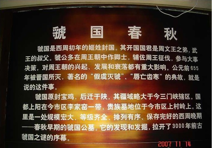 虢國是西周初年的姬姓封國。其開國國君是周文王之弟,武王的叔父。虢公多在周王朝中作卿士,輔佐周王征伐,參與大事決策,對(duì)周王朝的興起、發(fā)展和衰落都有重大影響。公元前655年被晉國所滅,著名的"假虞滅虢"、"唇亡齒寒"的典故,就是說的這件事。