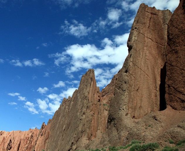 維吾爾語“克孜利亞”是“紅色的山崖”之意。神秘的“天山大峽谷”是天山支脈克孜利亞山中的一條峽谷,紅褐色巖石經(jīng)過大自然億萬年的風刻雨蝕之下,才形成由現(xiàn)在“天山大峽谷”。“天山大峽谷”紅褐色的山體群直插云天,在陽光照射下,猶如一簇簇燃燒的火焰。“天山大峽谷”的迷人之處,不僅僅在于它的雄奇、險峻,而在于它的幽深、寧靜和神秘。站在谷底仰視高山,只覺得陡峭的峰巒似乎隨時隨刻都會壓下來,令人感到窒息、眩暈。