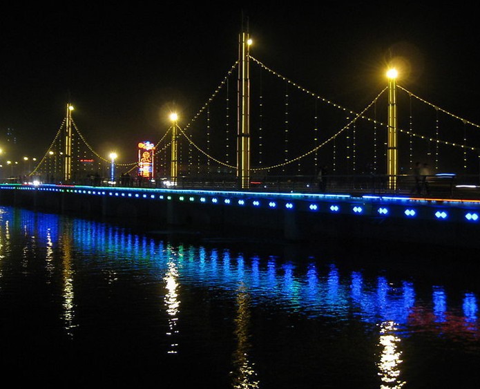 孔雀河橫穿庫(kù)爾勒市區(qū),把庫(kù)爾勒市分為南北兩半,北面以州市地方單位為主,南面以塔里木勘探開發(fā)指揮部及石油單位為主。在市區(qū)長(zhǎng)達(dá)七公里的孔雀河上共有五座橋,有孔雀河大橋、獅子橋、建設(shè)橋、團(tuán)結(jié)橋等。上游的孔雀河大橋是314國(guó)道跨越孔雀河上目前最大的橋梁,橋跨150米,寬24。5米,是我國(guó)西北地區(qū)最大的一處拱形鋼橋,河面無橋墩,它是孔雀河在庫(kù)爾勒市區(qū)的一處重要景觀,是孔雀河濱風(fēng)景旅游帶上一道獨(dú)特風(fēng)景線。近些年庫(kù)爾勒市從實(shí)際出發(fā),利用孔雀河穿城而過的優(yōu)勢(shì)建設(shè)了孔雀河風(fēng)景旅游帶工程。風(fēng)景帶基礎(chǔ)設(shè)施完善,綠草如茵、鮮花怒放、景色宜人,成為市區(qū)一道亮麗的綠化美化線和旅游風(fēng)景線。一方水土,因風(fēng)雅而美麗;一座城市,因歷史的積淀和教養(yǎng)而文明。版權(quán)所有山東聊城聊之旅國(guó)際旅行社有限公司,轉(zhuǎn)載必究!現(xiàn)在的孔雀河市區(qū)段玉水如帶,百步一景。清晨,薄霧輕紗,爽氣怡人;晚間,夕陽(yáng)鋪水,依稀將人帶入夢(mèng)中仙境。早晨鍛煉身體的人在這里吐故納新,采天地之精華;傍晚,休閑的人們?cè)谶@里納涼散步,觀夜景之妙。如潮的人流摩肩接踵,使孔雀河畔洋溢出一種節(jié)日的氣氛。