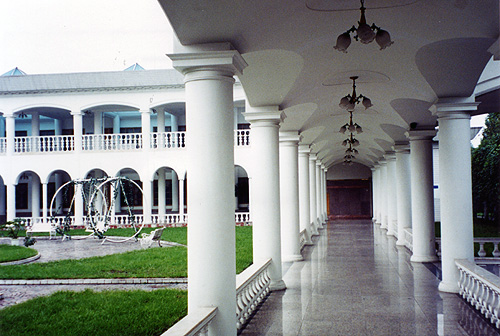 伊甸宮:一座中西合璧的建筑,中國(guó)傳統(tǒng)的庭院式與歐式建筑的線(xiàn)條、廊柱建筑風(fēng)格相結(jié)合。通長(zhǎng)的圍廊,漢白玉石柱,具有良好的裝飾性和使用功能,使您的戶(hù)外活動(dòng)不受氣