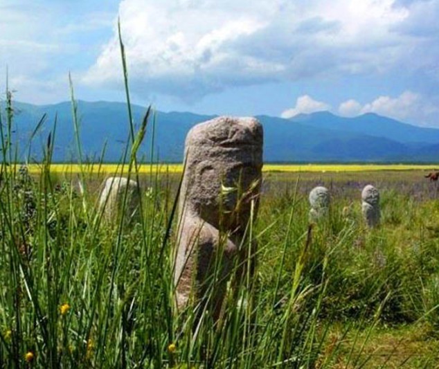 烏孫古墓又稱作烏孫土墩墓或草原土墩墓。據1988年新疆伊犁地區(qū)文物普查結果表明,在新疆伊犁州廣闊的草原上分布著萬座土墩墓。考古工作者曾挖掘一底部周長200米,墓高10多米的大墓,估計封土堆的體積達一萬多立方米,需動用3萬人工,封堆中部的長方形墓室體積近100立方米,用木材近50立方米。不妨設想,將這一萬座土堆墓一個一個排列起來,將連接1千余公里,是一座多么浩大壯觀的人類建筑,而當年在生產力很原始的情況下營構這樣眾多的大墓又要耗費多少人力物力!在夏塔草原上可以看到一座巨大的土墩墓,似座小山,底部周長有200多米,高有10多米,頂部較平坦,外形像個巨大的梯形,想來可能是千百年的風吹日曬而使頂部逐漸變得平坦了吧!墓的頂部還有牧民豎起來的枯樹枝,上面綁著各色布條,以祈求他們的幸福平安。墓的底部周圍還能看到露出泥土的大型石頭,這是死者生前作戰(zhàn)時打死過多少敵人,就在墓周圍放多少石頭,以銘記其功績。解放后考古工作者先后在伊犁挖掘了幾座烏孫土堆墓,出土了青銅器30余件,其中有鑿、鏟、鈴、缽、碗、梳、箭頭、短劍、武士俑、三足鼎,還有陶壺、陶缽等大量珍貴文物。