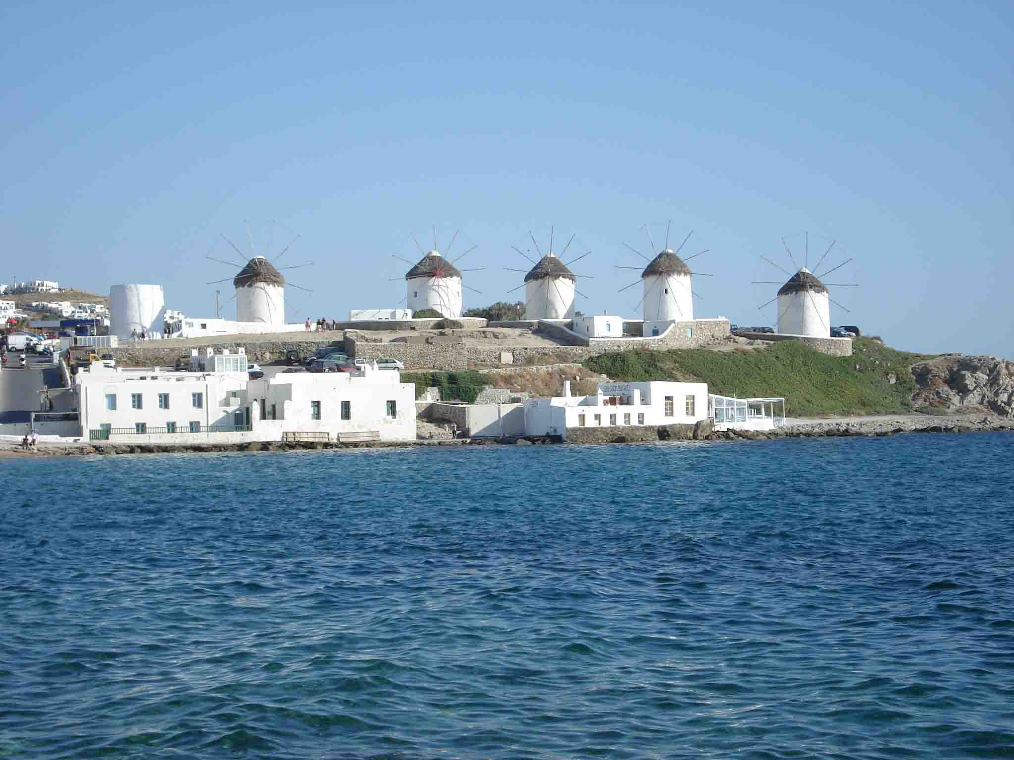 米克諾斯島是希臘南部基克拉澤群島中的一座,也是愛(ài)琴海上最享盛名的度假島嶼之一。島上居民很少,每年大約半年的非旅游時(shí)間,島上相當(dāng)安靜。四月以后,旅游季節(jié)開(kāi)始了,來(lái)自世界各地的游客就像候鳥(niǎo)一樣絡(luò)繹不絕地飛來(lái)島上,享受地中海的陽(yáng)光和海灘。在島上漫步,看到房頂都是用大石塊壘起的平頂,覺(jué)得很奇怪。問(wèn)了當(dāng)?shù)氐木用窈蟛胖?,島上冬天寒冷,風(fēng)特別大,只有這些結(jié)實(shí)的屋頂才能抵御寒風(fēng)。在島西南面海邊的小山丘上,有5座基克拉澤式的風(fēng)車,這是米克諾斯島的標(biāo)志。