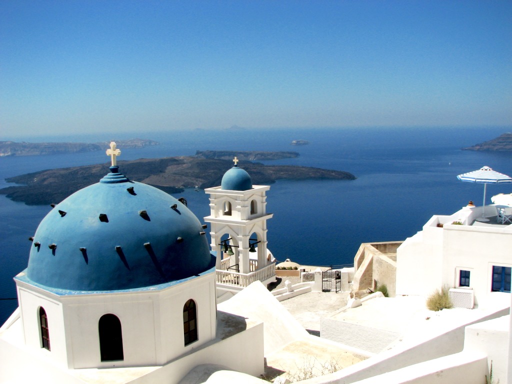 從米克諾斯島乘船到圣特里尼島約需5小時(shí)航程。來(lái)到以后,才知道很多觀光手冊(cè)和旅行社都把米克諾斯島和圣特里尼島作為推薦給游客的首選,是不無(wú)道理的。我們的油輪剛靠岸,大家就驚奇地發(fā)覺(jué),海邊陡峭的山崖呈紅褐色,山崖的頂端是一片白色的房屋,小巧明麗。據(jù)說(shuō),該島位于世界兩大大陸板塊最深的海溝之間,原來(lái)是圓形的。3500年之前的一次火山爆發(fā),島嶼被震出一個(gè)大洞,一大塊月牙形的就成了主島,周圍還有幾個(gè)小島,其中一個(gè)小島納亞卡美尼至今還是活火山。