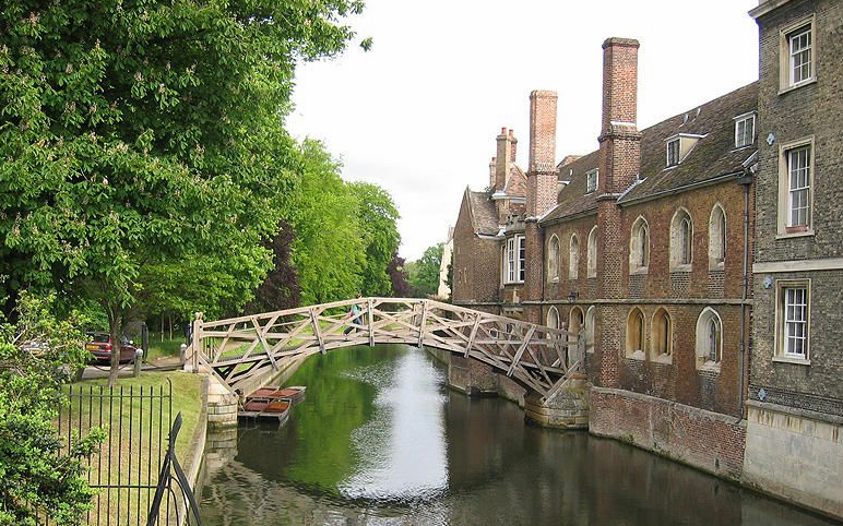 走進(jìn)皇后學(xué)院,可以見到一座古老的木橋橫跨于劍河之上,這就是舉世聞名的數(shù)學(xué)橋,又叫作牛頓橋。相傳牛頓采用數(shù)學(xué)和力學(xué)的方法設(shè)計并建造了這座橋,橋上沒有用一顆釘子。牛頓的學(xué)生認(rèn)為:牛頓老師能做到的事,牛頓的學(xué)生也能夠做到。他們把這座橋拆了,可是怎么也不能把這座橋不用釘子恢復(fù)成牛頓老師建筑的原樣,最后不得不用釘子才重新將木橋架好。這個故事是假的,因為數(shù)學(xué)橋是在牛頓死后22年才建起來的。真正的情況是,該橋最早是用鐵釘連接,比較不明顯,但是現(xiàn)在新造的這座用的是螺絲。(不過這座橋似乎確實是被一名好奇的學(xué)生拆開來,然后再重新裝回去的)。