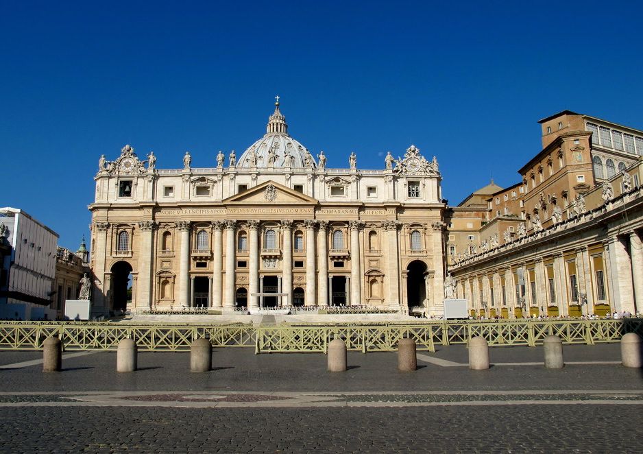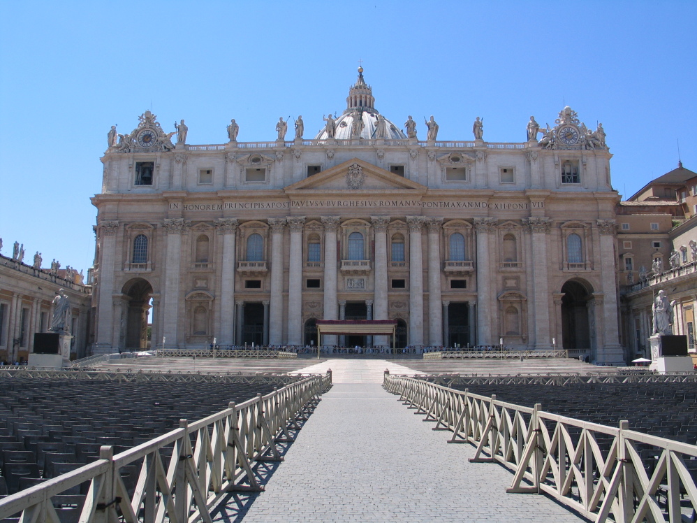兩千年前的簡單墓地,四百年后修建了一座長方形會堂,后來毀于戰(zhàn)亂,一千年后尼古拉五世頒發(fā)重建命令,之后就是長達120年的重建,先后由意大利最優(yōu)秀的建筑師住持設計施工,布拉曼特來了,米開朗琪羅來了,德拉?波爾塔來了,卡洛?馬泰爾也來了。1626年11月18日正式宣告落成,一臉肅穆的教皇烏爾班八世主持落成典禮。