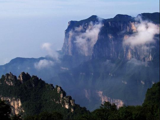 山之東崖俗稱天柱關(guān),由高低錯(cuò)落的五六十個(gè)山峰組成,大者峰頂可跑馬,小者狀如筆尖聳立,有“駝鳥(niǎo)峰”、“一柱峰”、“仙女峰”、“天官賜福峰”、“龍泉寶劍峰”、“蓮花峰”等等。山南部千仞峭壁,如巨斧削成,自古就被形容為“千峰爭(zhēng)攢聚,萬(wàn)壑絕凌厲”。北部危巖相迭、青蓮秀出,群峰連綿,仰俯之間,只見(jiàn)怪石嶙峋,濃綠淺翠,流泉飛瀑。