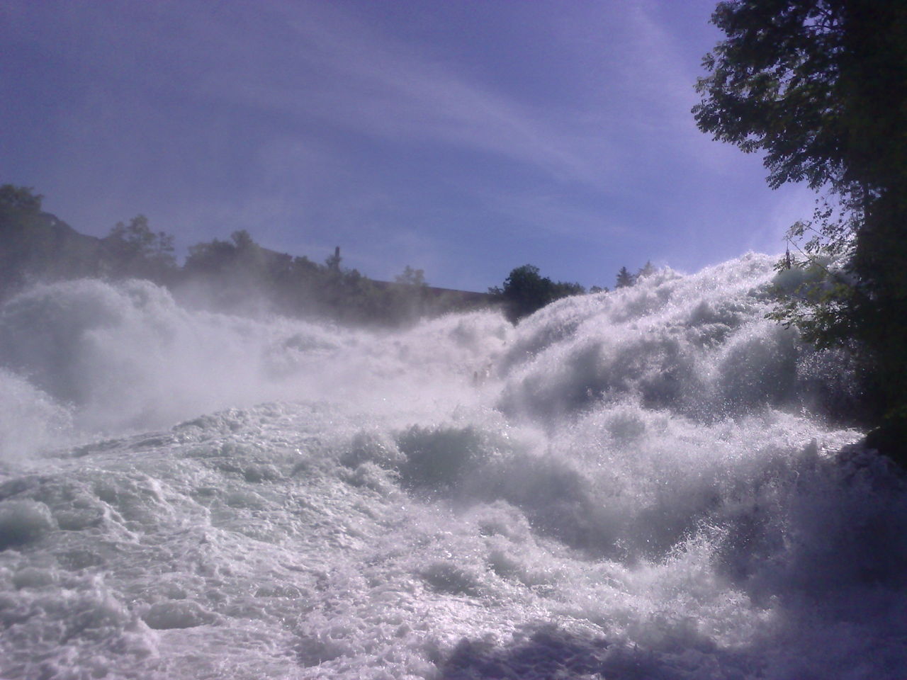 中歐最壯觀的瀑布,在瑞士北部萊茵河上游。包括一些險(xiǎn)灘在內(nèi),全部落差約30米(100呎),寬150米(492呎)。一塊柱狀巖石把瀑布分成兩個(gè)主要部分,位于河右岸的落差約15米(50呎),左岸約20米(65呎)。