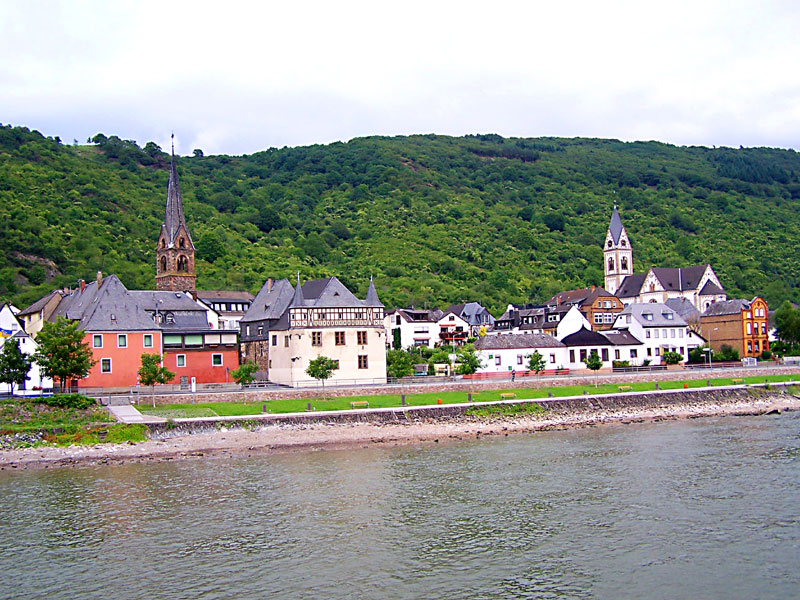 萊茵河谷位于萊茵河的中上游段。從賓根開始,對岸就有呂德斯海姆小鎮(zhèn)和享有“紅葡萄酒之鄉(xiāng)”美譽的阿斯曼豪森小鎮(zhèn),兩鎮(zhèn)間山頂上有紀念德意志統(tǒng)一的尼德瓦爾德巨大紀念雕塑和山下的阿倫費爾斯古堡廢墟。這里標志著中萊茵河谷上游的開端,相當于長江三峽的夔門峽口。
