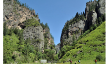 從卓尼縣城沿洮河向東,經(jīng)“石媳婦”(矗立于洮河岸邊的一座石峰)、博峪楊土司衙門遺址,便到大峪溝口的多壩村,向南沿林區(qū)公路進大峪溝4公里,就到大峪河上的云江峽。云江峽猶如被縮小了的九巔峽,西壁高約百米,東壁高30~50米,峽長500多米,其間石峰嵯峨,石門如屏,蒼松翠竹葳蕤,河水清冽碧綠,鳥鳴枝頭,魚翔淺底,可謂一幅絕妙的圖畫。