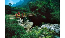 神農溪,發(fā)源于神農架主峰,流經湖北巴東縣境內,由北向南穿行于深山峽谷之中,至巫峽口東匯入長江。神農溪是一條典型的峽谷溪流,兩岸山峰緊束,絕壁峭聳,溪水在刀削般的峽壁間沖撞,水道曲折,湍急的溪流中有險灘、長灘、彎灘、淺灘六十余處。水道雖狹急卻清淺,漂流極富刺激而又安全。