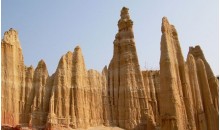 虎跳灘土林位于元謀縣城西北32公里的物茂鄉(xiāng)虎溪行政村,又稱物茂土林,芝麻土林,總面積2.3平方公里?;⑻鵀┩亮中螤钜猿潜睢⑵溜L(fēng)狀、簾狀為主,高度一般10?15米,最高27米。