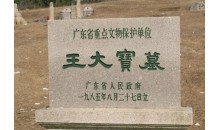 王大寶墓位于潮安縣歸湖鎮(zhèn)神前村的神前山,其地俗稱(chēng)沉江月,占地約4畝,筑于宋乾道六年(1170)。墓地向西,墓碑高約2.3米,楷書(shū)陰刻“宋禮部尚書(shū)大寶王公墓”。墓前排列著南宋大型石雕群,計(jì)文武翁仲、石獅、石羊、石筍、石望柱、石馬等14件,石雕線條粗?jǐn)U,工藝簡(jiǎn)練古樸,反映了南宋的雕刻藝術(shù)水平和風(fēng)格,是廣東省現(xiàn)存為數(shù)不多的大型宋代石雕。1989年王大寶墓被列為廣東省重點(diǎn)文物保護(hù)單位。