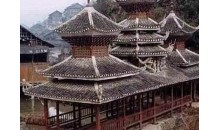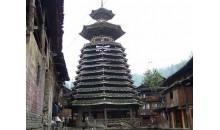 苗族鼓樓在臺(tái)江縣城東南方20公里的排羊鄉(xiāng)九擺村上寨中間,樓旁古木參天,蒼翠綠郁。 鼓樓為三重檐歇山頂屋面,木結(jié)構(gòu)建筑,覆蓋小青瓦,其 下層呈平面四方形,空間寬敞。樓高11米,占地52平方米,整 個(gè)建筑結(jié)構(gòu)以中間獨(dú)柱為中心,周圍16根外環(huán)檐柱為襯。利用 逐層內(nèi)收的粱、枋、瓜柱、檐柱支撐挑出屋檐。結(jié)構(gòu)無一釘一 鉚,攆橫穿斜插,銜接緊密牢固。前后留進(jìn)出通道。