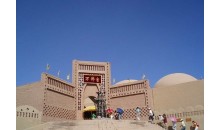 煙云燎繞的火焰山下,郁郁蔥蔥的木頭溝畔,一座規(guī)模宏大的人文 景觀,以其獨特的藝術風格,屹立在312國道西側,它就是1991年5月對 外開放接待游人的新疆大漠土藝館, 地理坐標89°32′7″E,42°56′ 8″N,海拔140米,由312國道的勝金口往北拐上前往柏孜克里克干佛洞的旅游專線公 路四公里處,便可看到大型停車場后的高坡上矗立著一座高大的民族風格建筑群,正中是十四米高的磚砌圖案大門.