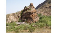 后召廟遼石窟寺位于巴林左旗林東鎮(zhèn)西南約25公里的峽谷中。石窟開鑿在谷內南向的陡壁上,窟前有大殿,面闊7間,進深3間??叻种小⒛?、北三窟,均較完整。中窟正中為釋迦佛涅盤像,俗稱臥佛,佛像兩側有菩薩及弟子像,作痛哭流涕狀,形象逼真,惜已殘損。南窟刻有釋迦佛、文殊菩薩、普賢菩薩及力士像。北窟分南北兩小室,北小室雕像同于南窟,南小室的佛像兩下側方,刻有契丹裝束的供養(yǎng)人浮雕像,其旁浮雕力士像一對,面目猙獰,腳著長靴,頗有地方特色。