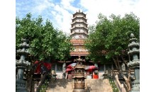 據(jù)清光緒《嘉應(yīng)州志》載,由南漢王劉鋹始建于大寶八年(公元965年),距今已有一千多年歷史。鐵塔分為七層,身高4.2米,呈四方形,塔底邊長1.6米,為生鐵鑄成,每面鑄有大小佛像250個,四面合計為一千佛,故名千佛塔。原塔建于修慧寺,因寺毀,清乾隆初年嘉應(yīng)州官王者輔將鐵塔移于梅城東巖山頂,上面蓋亭宇,周圍筑欄桿,并砌石階,以供游覽者登臨觀賞。